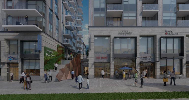 Grouped around the generous park space and plaza, four buildings of varying heights and angles are designed to maximize daylight and views, while complementing the single-family home aesthetic of the neighbourhood. Spacious balconies with differentiated design add exterior interest, with variegated cladding referencing the shoreline landscape that once lined the Fraser River.